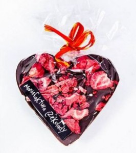 Czekoladowe serce z truskawkami. Czekolada wyróżnia się dużą ilością kakao (44%) oraz dużymi kawałkami truskawek. Sympatyczny prezent nie tylko na Walentynki.