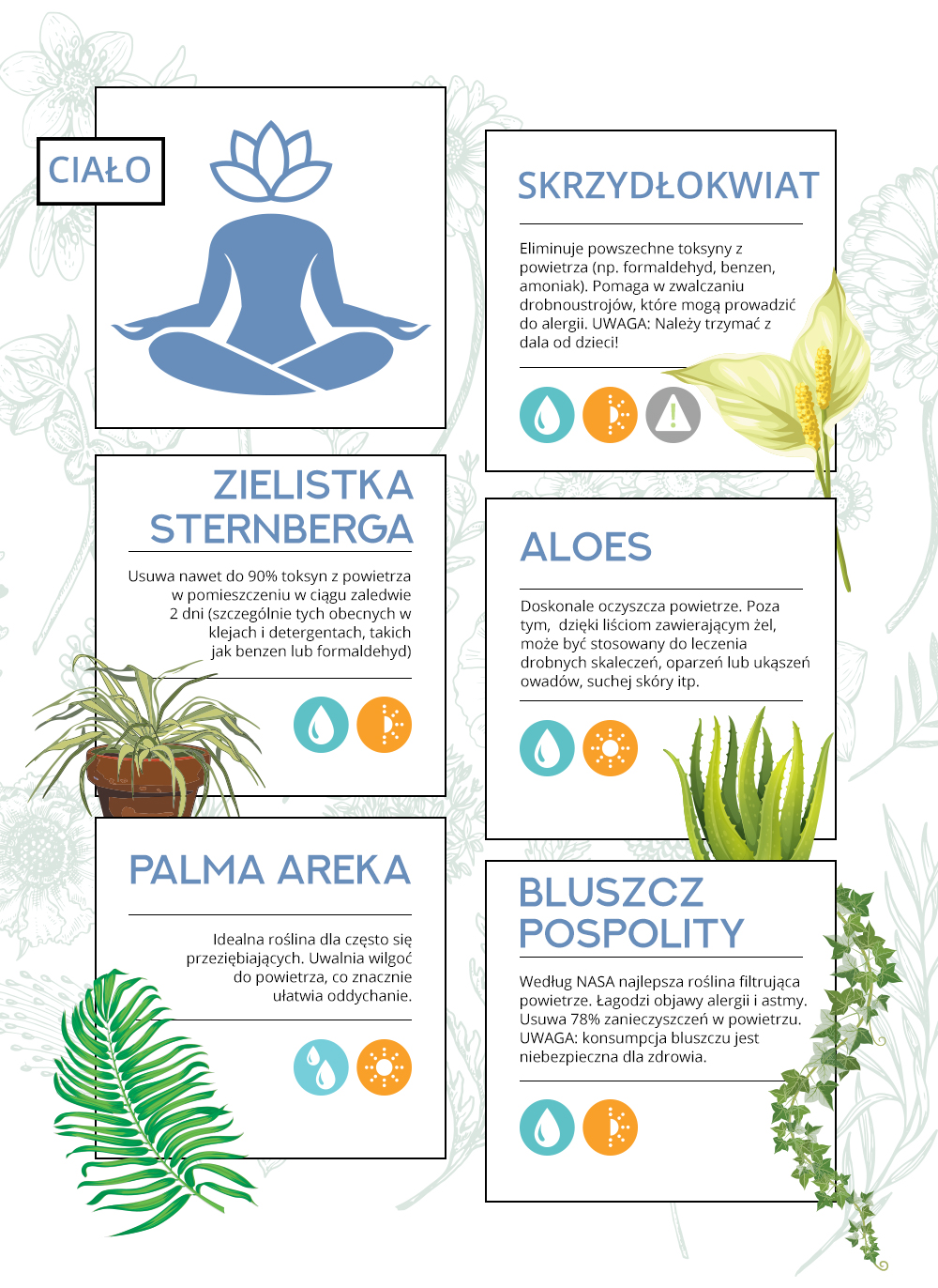 Posiadanie roślin w domu, pozwoli nam pozbyć się w znaczącym stopniu toksyn, często występujących w chemii gospodarczej, czy w plastiku występującym w naszych domach. Szczególnie skuteczna jest tu zielistka Sternberga, która potrafi usunąć nawet do 90% toksyn z powietrza w pomieszczeniu w ciągu zaledwie dwóch dni. Godnymi polecenia są też skrzydłokwiat, palma areka, czy bambus, które poprawiają jakość powietrza o nawet 60%, a także zwiększają jego nawilżenie o nawet 5%. To z kolei pomaga złagodzić objawy alergii, a także przeziębienia, czy problemów z zatokami.