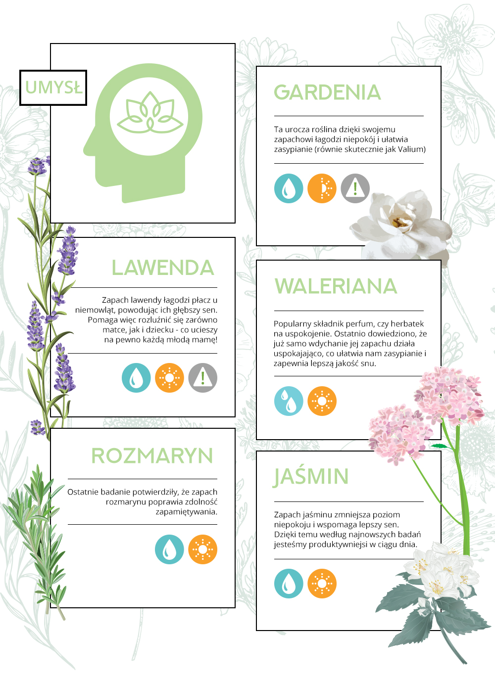 Zapachowo działają na nas także jaśmin i gardenia. Jaśmin pomaga łagodzić niepokój i bezsenność, gardenia zaś pozytywnie wpływa na naszą produktywność. Kolejną rośliną o supermocach jest waleriana, którą już od czasów starożytnych stosowano pod postacią herbatek, czy nalewek na bezsenność. Niedawno naukowcy odkryli natomiast, że już sam zapach waleriany może mieć pozytywne działanie na jakość naszego snu.