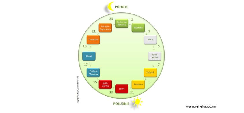 * Cztery ostatnie nocne godziny przypadają kolejno dla pęcherzyka żółciowego (23-1) oraz wątroby (1-3 nad ranem). Wątroba regeneruje się właściwie tylko podczas snu, przy czym szkodzą temu procesowi wszystkie nadmiarowe dźwięki i bodźce (np. zasypianie przy telewizji)