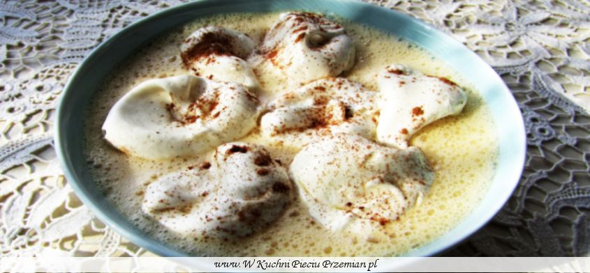 Dodać 8 żółtek, szczyptę imbiru, sól. Dokładnie zmiksować. Przestudzić, potem ponownie zmiksować i schłodzić. Białka ubić na sztywną pianę (najpierw same, pod koniec ubijania dodajemy cukier, imbir i na końcu sól). Ubitą pianę z białek wyłożyć łyżeczką na wrzątek, gotować około minuty, wyjąć łyżką cedzakową. Ułożyć na półmisku, posypać cynamonem i odstawić do schłodzenia. Pianki dodać do zupy tuż przed podaniem.